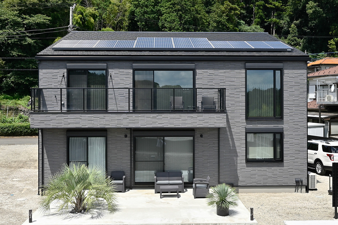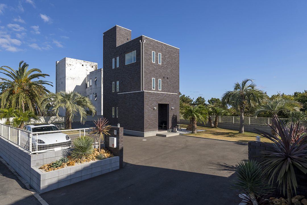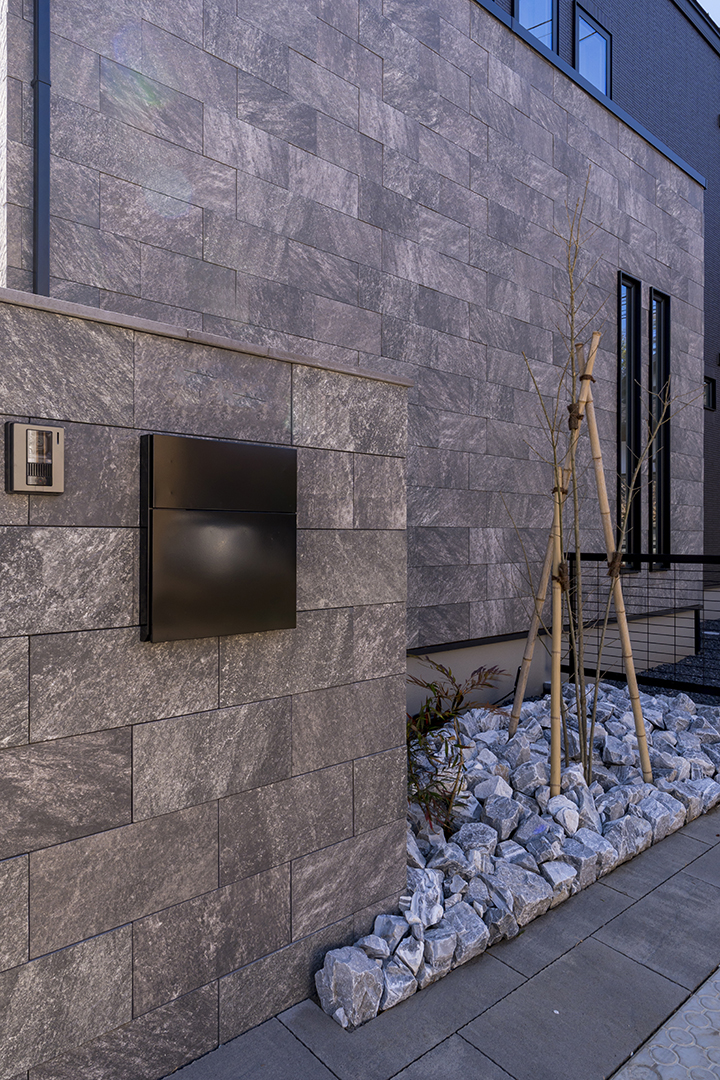 硬質なタイルとドライガーデンの相性の良さを生かし、リゾート地のホテルを連想する外観に。建物正面と裏側から、それぞれにあるガーデンの表情が楽しめます。→この施工実例を詳しく見る