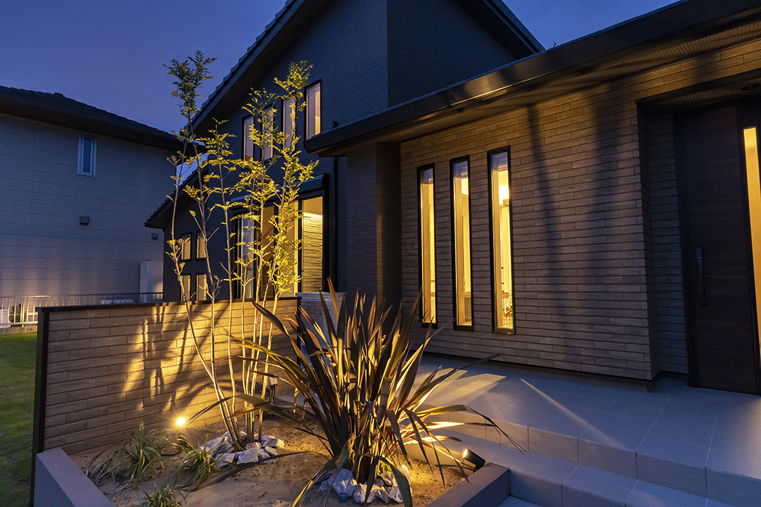 ニュージーランド原産の大ぶりなニューサイランが印象的なドライガーデン。夜間はライトアップされた植栽と木目調のタイルが、昼間とは違った表情を創り出します。照明はオシャレなだけでなく防犯効果も。→この施工実例を詳しく見る