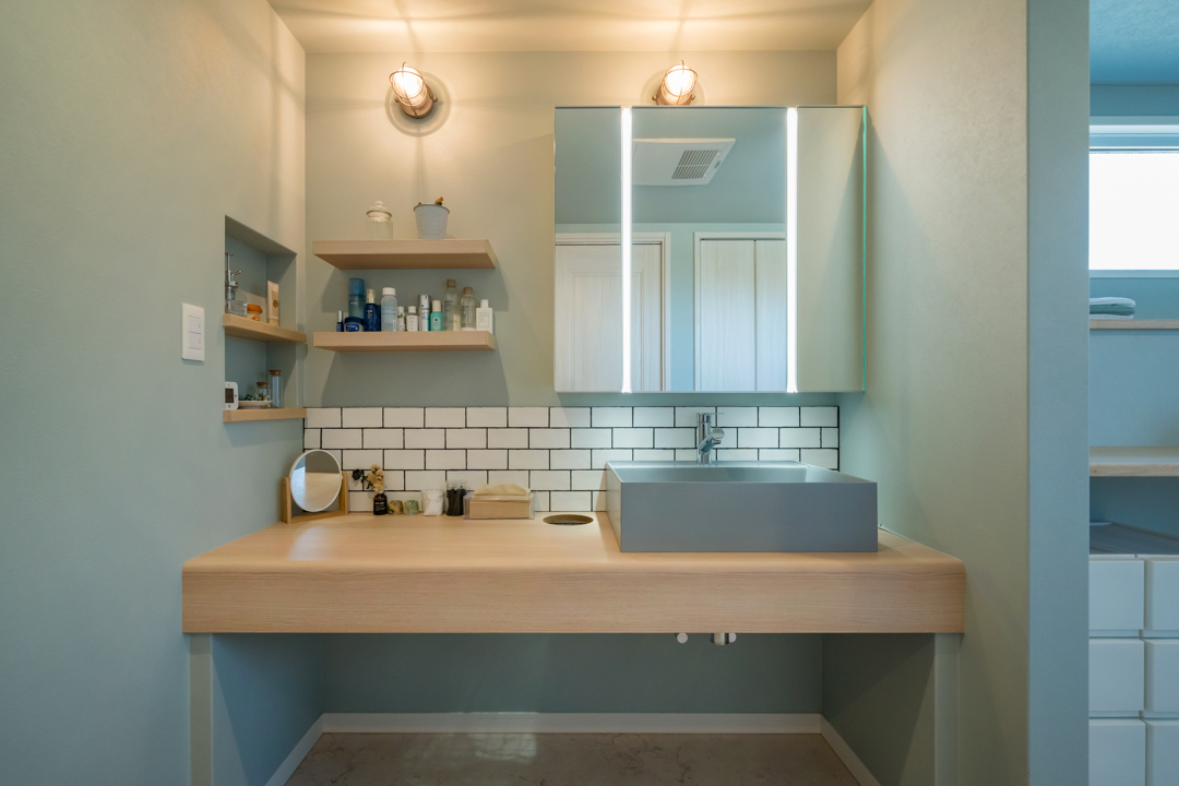 とくに造作洗面台の場合、背面にタイルを利用するとオシャレに統一感を持たせられます。掃除のしやすさを考えて、水や液体がハネても大丈夫な、フラットでざらつきのない質感のタイルがオススメ。写真の例も手入れが簡単なつやのあるサブウェイタイルを採用。壁紙の色と、清潔感のある白いタイルのコントラストがオシャレです。
