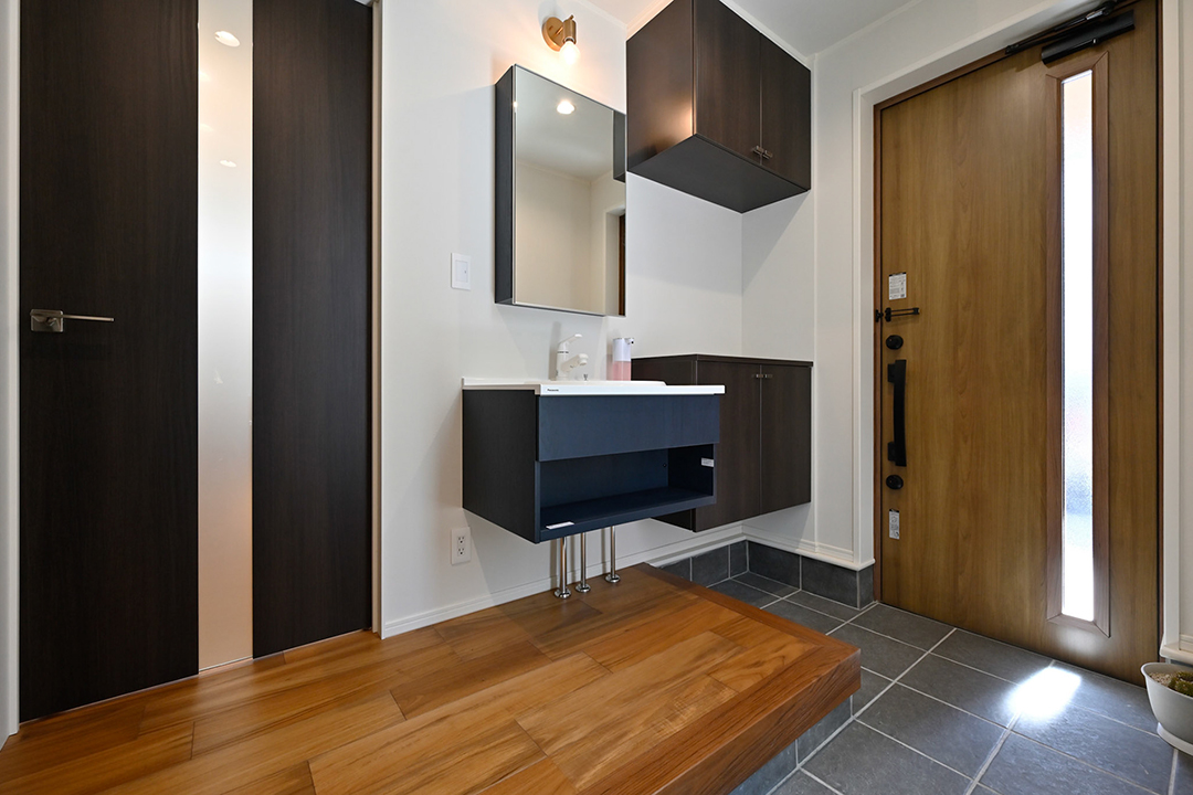 帰宅してすぐに手が洗えるように、玄関先に洗面台を設けた実例です。さらに2階ホールにもサブ洗面台を設けて利便性を高めています。メイン洗面台をそのままコンパクトにしたデザインに仕上げ、統一感を高めました。