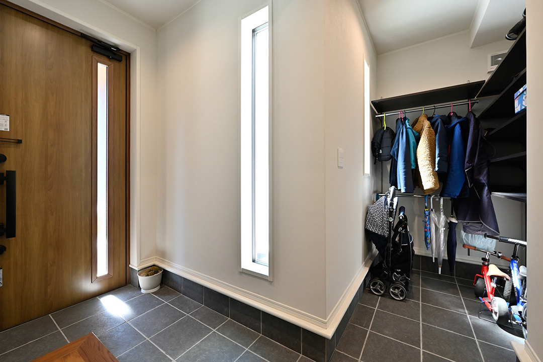 ウイルスや花粉が付着した上着を室内に持ち込まないように、土間続きのシューズクロークを設けました。いつもキレイな空気を保てるように、換気扇と窓を設けています。