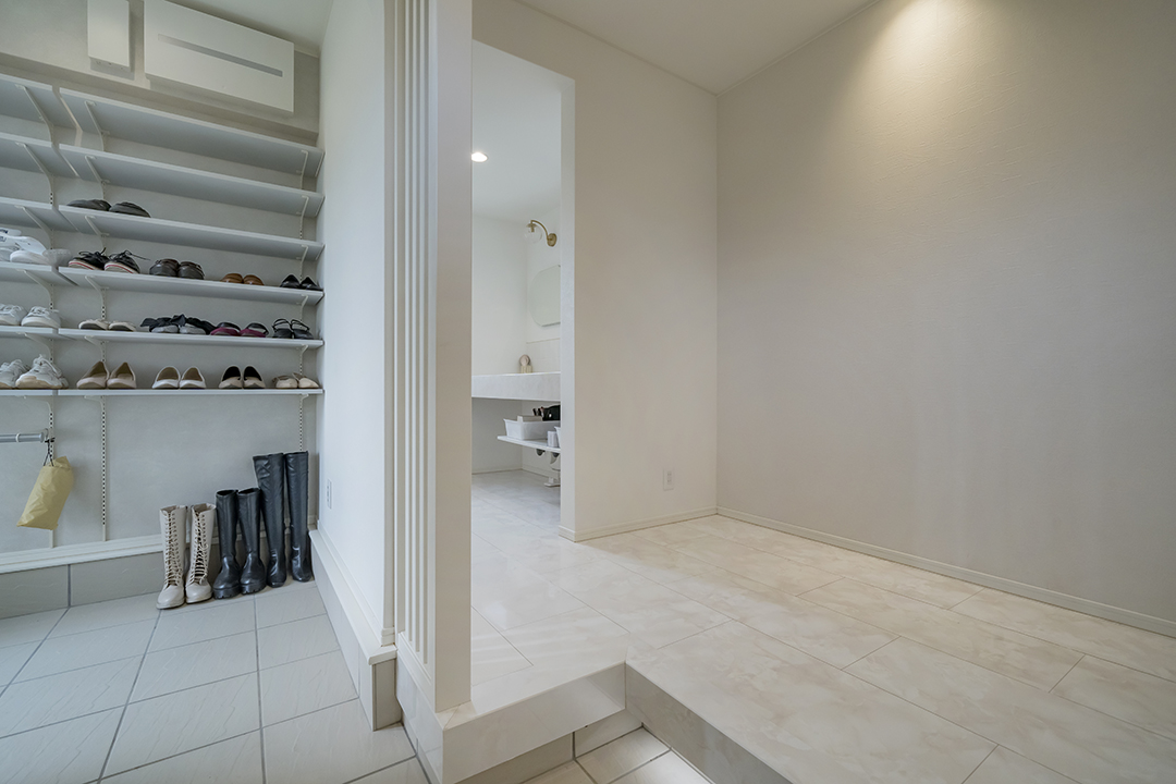 大容量のシューズクロークを設けた玄関。上がってすぐの場所に洗面台を設け、LDKに入る前に手を洗えるようにしています。