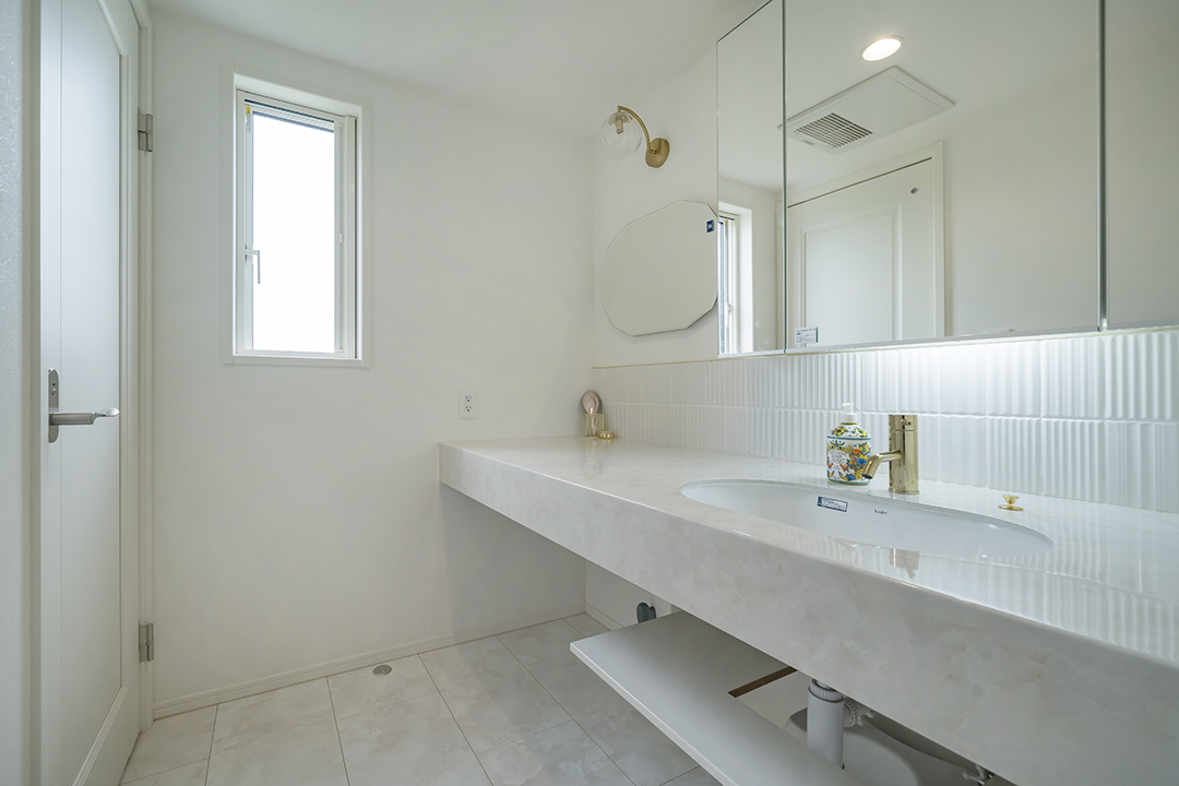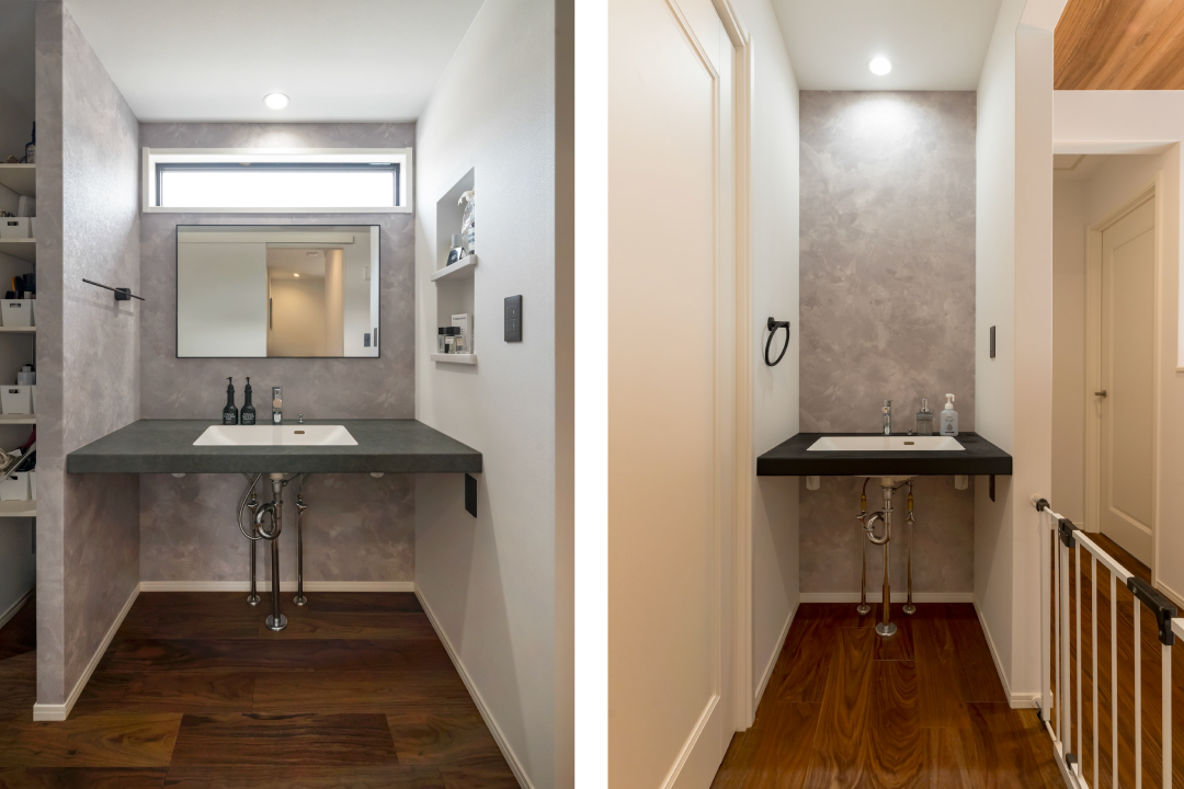 デザイン性にもこだわった造作洗面台。洗面台の向かいにはトイレがあり、外出前や帰宅後すぐに利用できます。
