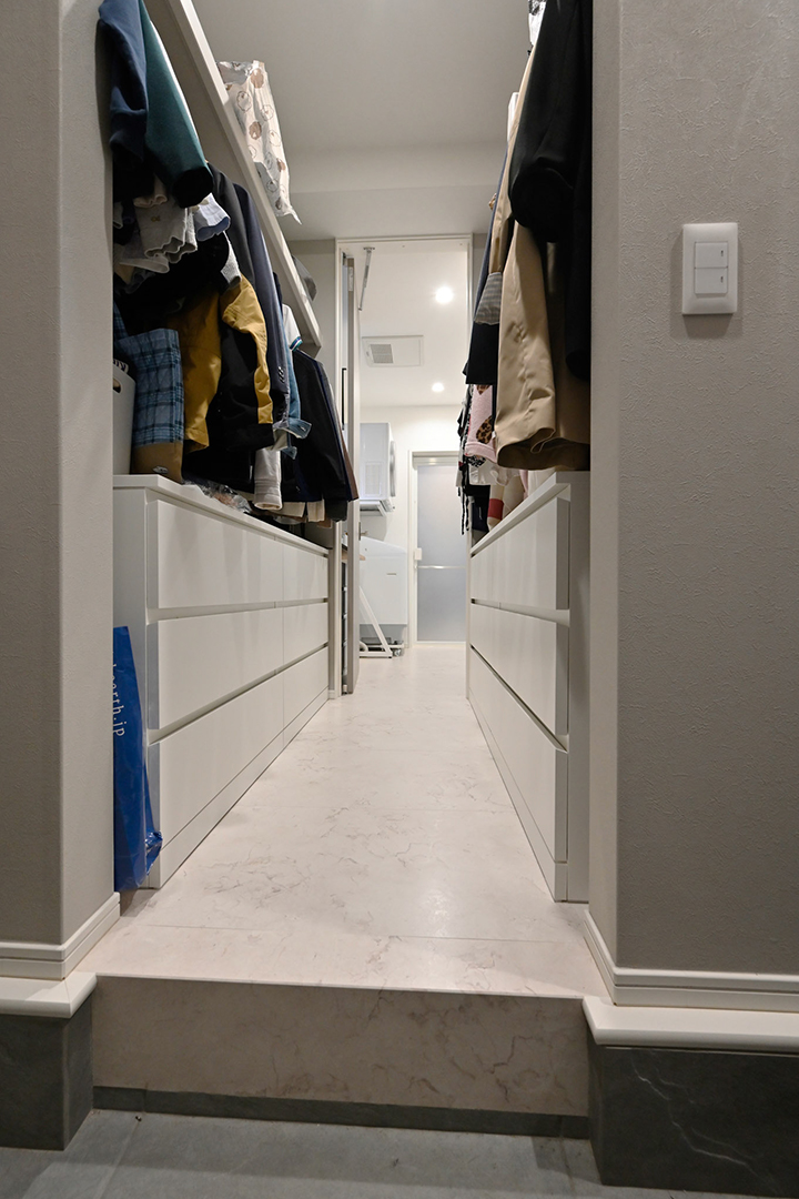 シューズクローク側から上がると、ファミリクローゼットをまっすぐ通り抜けて浴室に直行することが可能です。