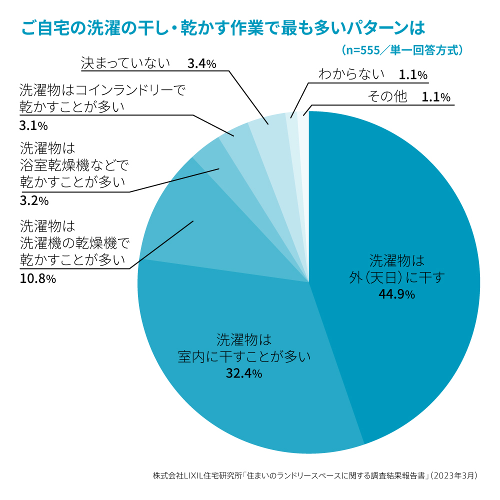 ファミリー世帯では、洗濯はほぼ毎日行う家事。そのため、どこで干すかを考えることは、家事動線を整える第一歩と言えます。室内干し・外干しのどちらを選ぶ場合でも、洗濯機の位置、物干しスペース、収納場所をセットで考えることが大切です。なお(株)LIXILが自宅の洗濯物の乾かし方について調査したところ、「洗濯物は外に干す」が44.9%、「洗濯物は室内に干すことが多い」が32.4%でした。