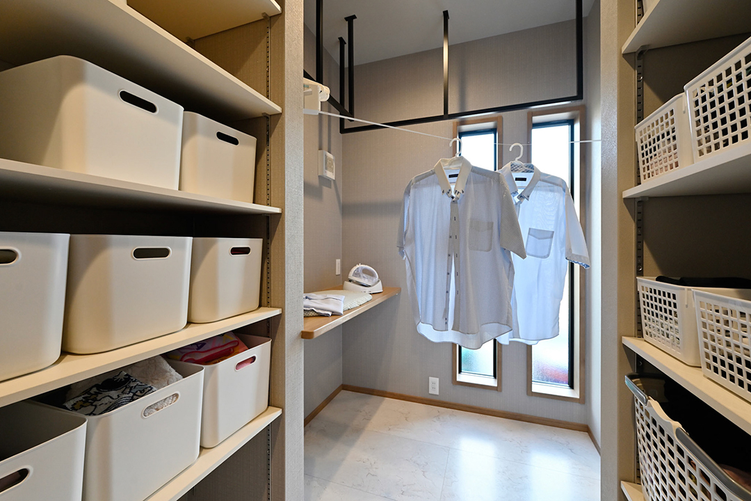 ランドリールームは、洗濯と物干し専用の部屋です。生活空間と切り離せるため洗濯物が目に入らず来客時にも気になりません。さらにランドリールームを収納の近くに設けると「洗う・干す・しまう」が集約され、洗濯動線を最短にすることができます。