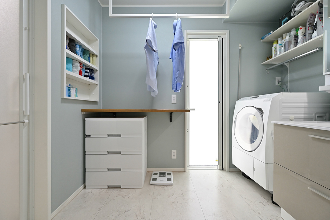 こちらの事例では、物干しの側に洗濯物を畳んだりアイロンを掛けたりするのに便利なカウンターを設けました。