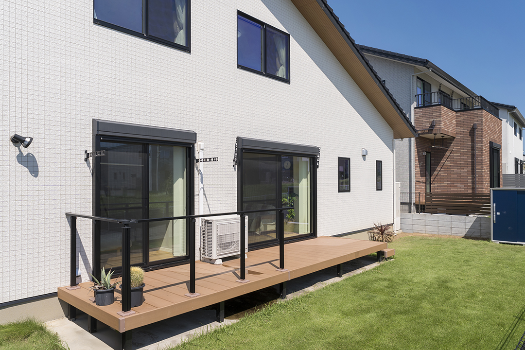 こちらの事例では、日当たりの良い庭のウッドデッキに、布団やラグなどの大物を掛けられるように手すりを設けました。