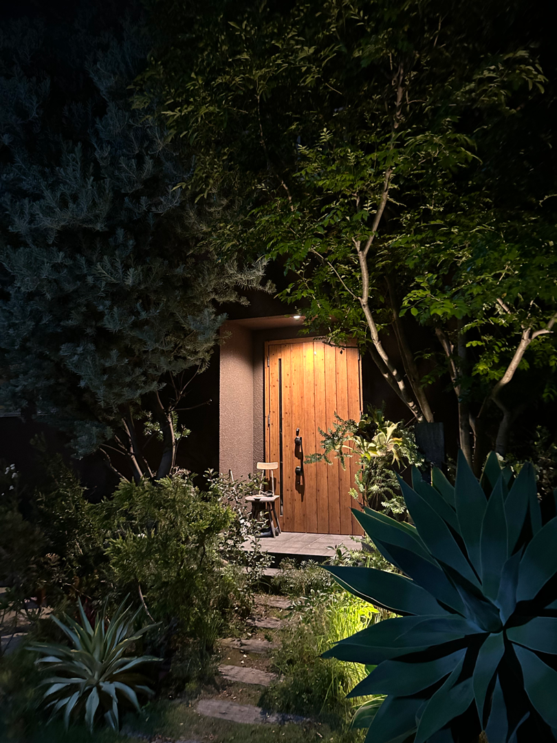 照明は、玄関灯・足元灯など建物側の計画をベースに、植栽のライトアップをひとさじ足すイメージで。
