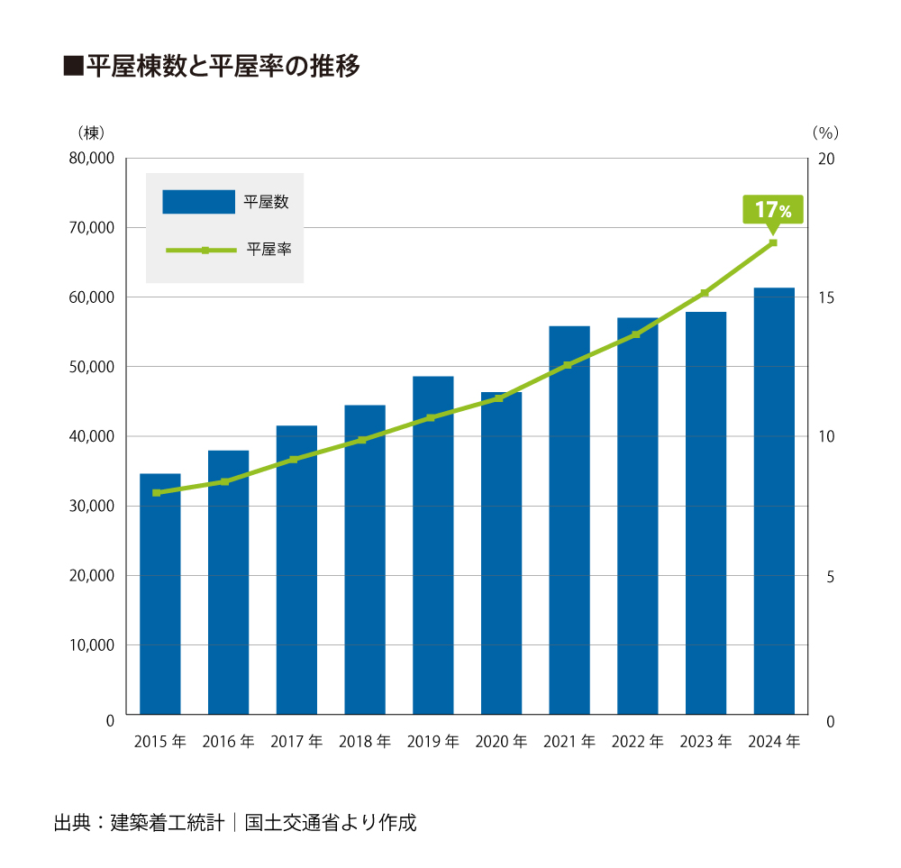 国土交通省発表の統計によると、新築戸建住宅における平屋の棟数および割合は増加傾向にあります。平屋率は2015年には約8%でしたが、2024年には約17%となり、じつに10年で2倍以上に増加しました。