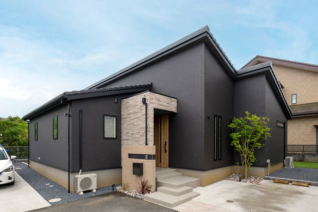 家事動線にこだわった平屋の住まいです。外観はスクエアの要素と片流れ屋根のシャープなラインを組み合わせてスタイリッシュな印象に。