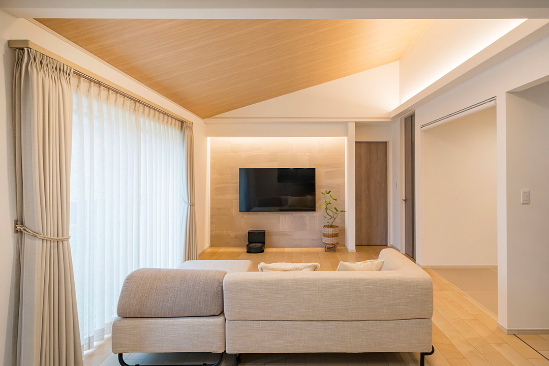 リビングは、勾配天井と間接照明で空間の広がりを演出。ベージュを基調としたナチュラルなトーンでまとめ、天井は木目調クロスで木に包まれるような温かみのある雰囲気に仕上げました。