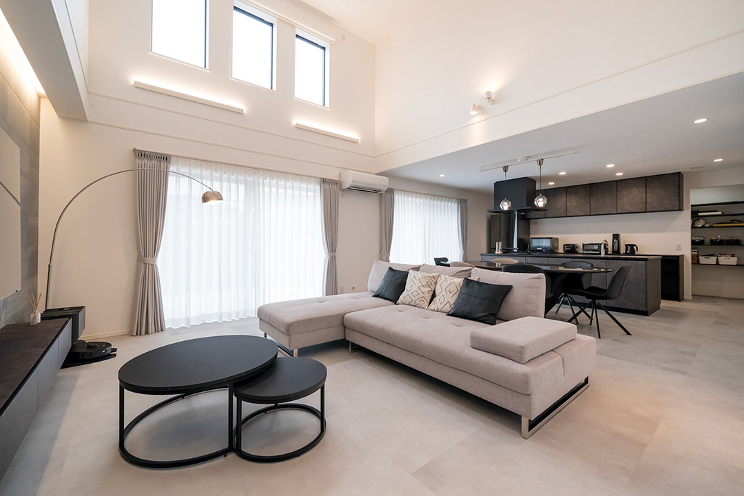 ダイナミックに広がる約25帖の吹き抜けリビングに、3連の高窓から眩しいほどの自然光が差し込みます。インテリアはモノトーンでまとめ、ホテルライクに仕上げました。