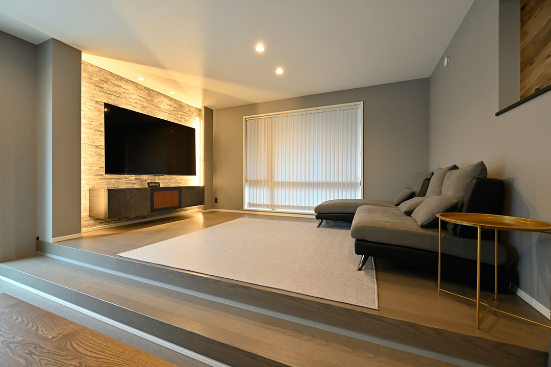フロアを2段上げることで「おこもり感」を演出したくつろぎのリビング。段差に腰掛けることもでき、家族が集まり思い思いに過ごすことができます。