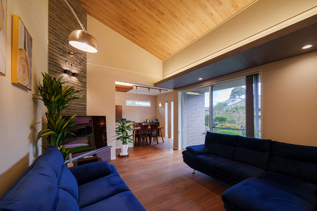 空間の広がりを感じられる、勾配天井のリビング。テレビ背面にエコカラットを貼り重厚感を演出しました。ワンフロアの二世帯同居ですが、お互いの寝室にほどよい距離感を設けてプライバシーに配慮しています。