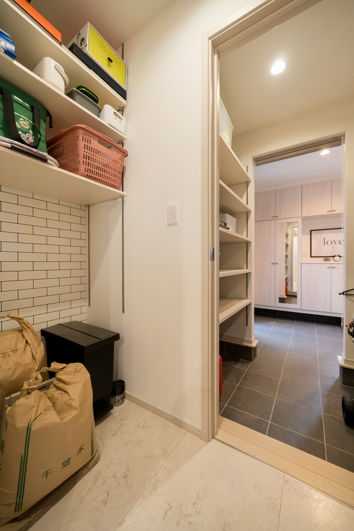 シューズボックスの向かいに設けた、土間続きのシューズクローク。灯油タンクやアウトドアグッズもスッキリと収めることができます。また、奥のドアでパントリーに直結しているため、荷物を直接運び入れて買い物動線を短縮できます。